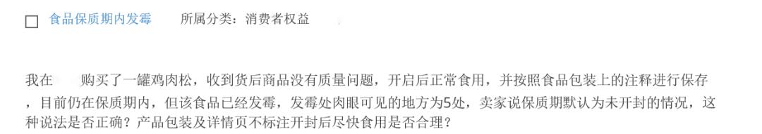 我在网上购买了一罐鸡肉松,收到货后,商品没有质量问题,开启后正常食用,并按照食品包装上的注释,进行保存。目前仍在保质期内,但该食品已经发霉,发霉处肉眼可见的地方为5处,卖家说保质期默认为未开封的情况,这种说法是否正确?产品包装及详情页不标注开封后尽快食用是否合理?